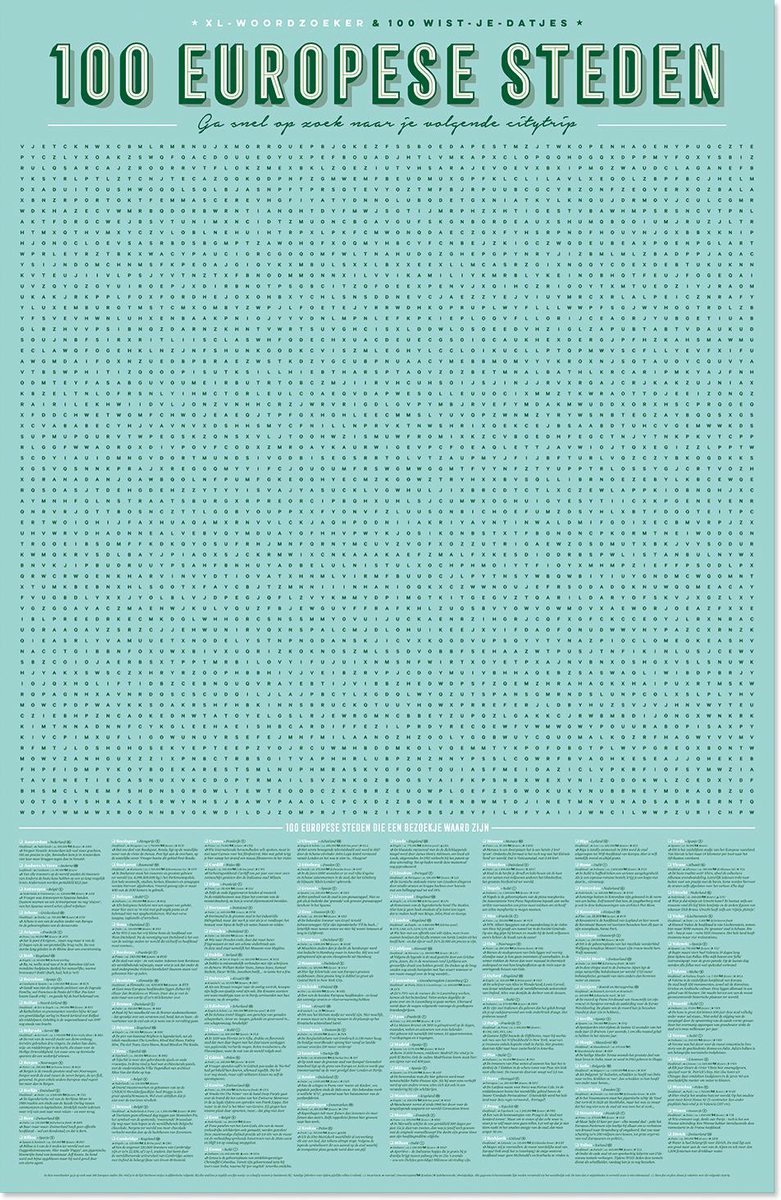 In deze mooi kwalitatieve XL-woordzoeker van 100 x 65 cm ga je op zoek naar 100 Europese steden. Hij is niet enkel mooi maar ook erg leuk! Fijn om met heel het gezin of samen met de collega’s aan te werken… Bij elke stad lees je tegelijk een fijn weetje: zo schaaf je meteen je basiskennis bij. Hij is verpakt in een mooie koker. Plan alvast je vakantie voor die volgende citytrip!
