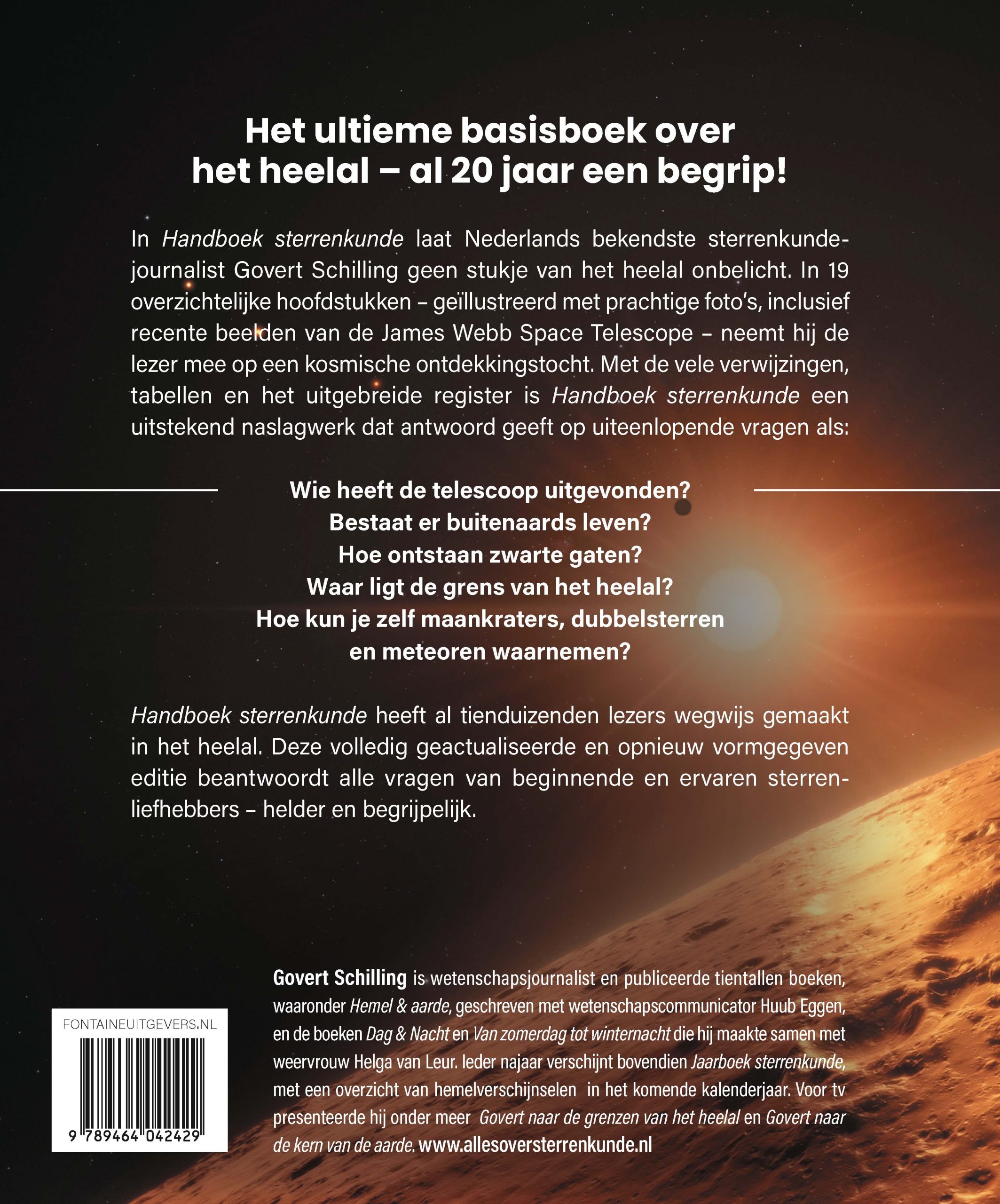 Handboek sterrenkunde, het ultieme basisboek over het heelal geschreven door wetenschapsjournalist Govert Schilling, bestaat 20 jaar en heeft al tienduizenden lezers wegwijs gemaakt in de astronomie. In deze volledig geactualiseerde jubileumeditie laat Govert Schilling geen stukje van het heelal onbelicht.